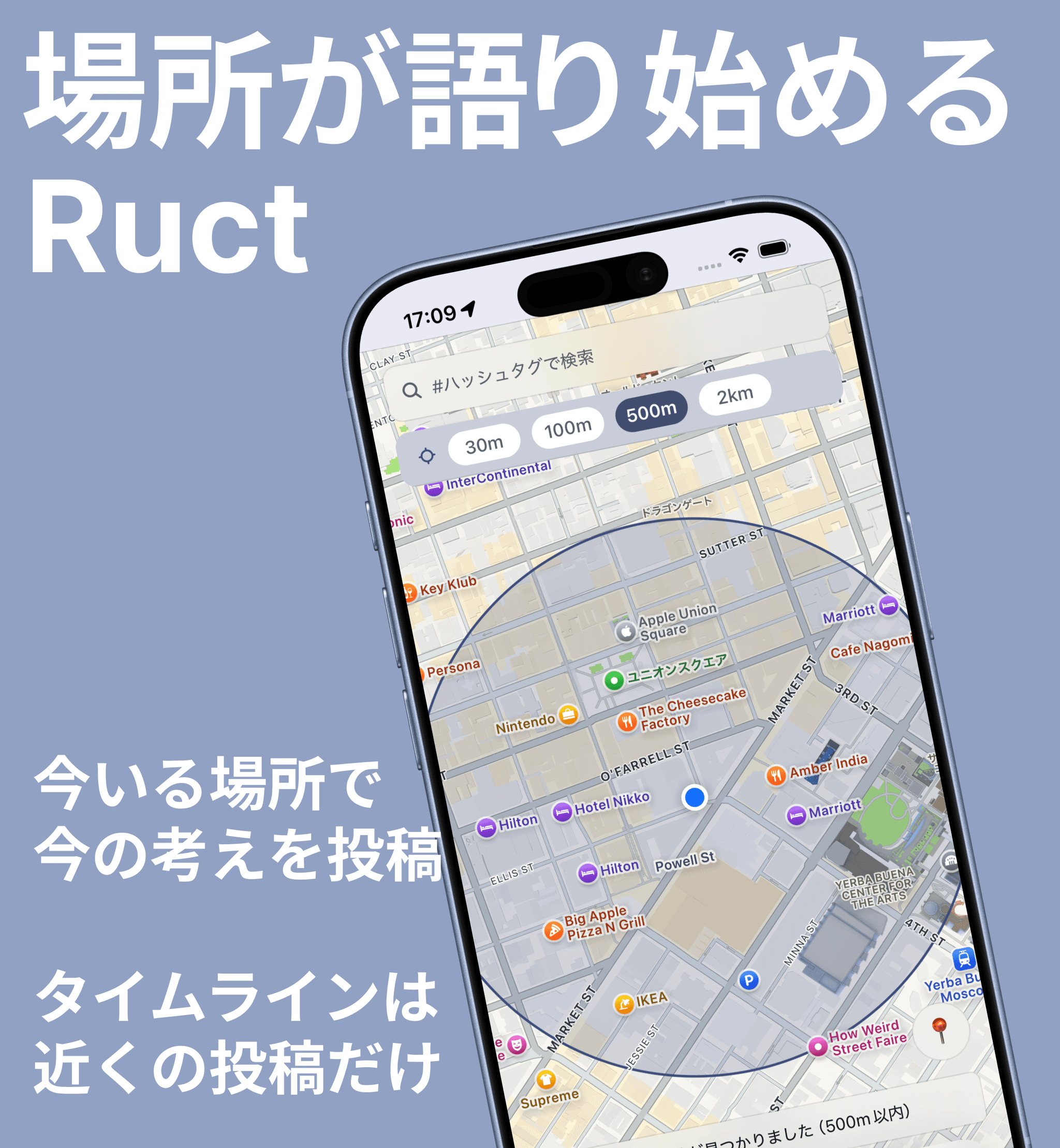 すべての投稿は現在地に紐づき、近くにいる人だけが読むことができます。外に出て街を歩くことで、まだ知らない地域の声やストーリーに出会える——Ructは「場所で発見する」体験を届けます。